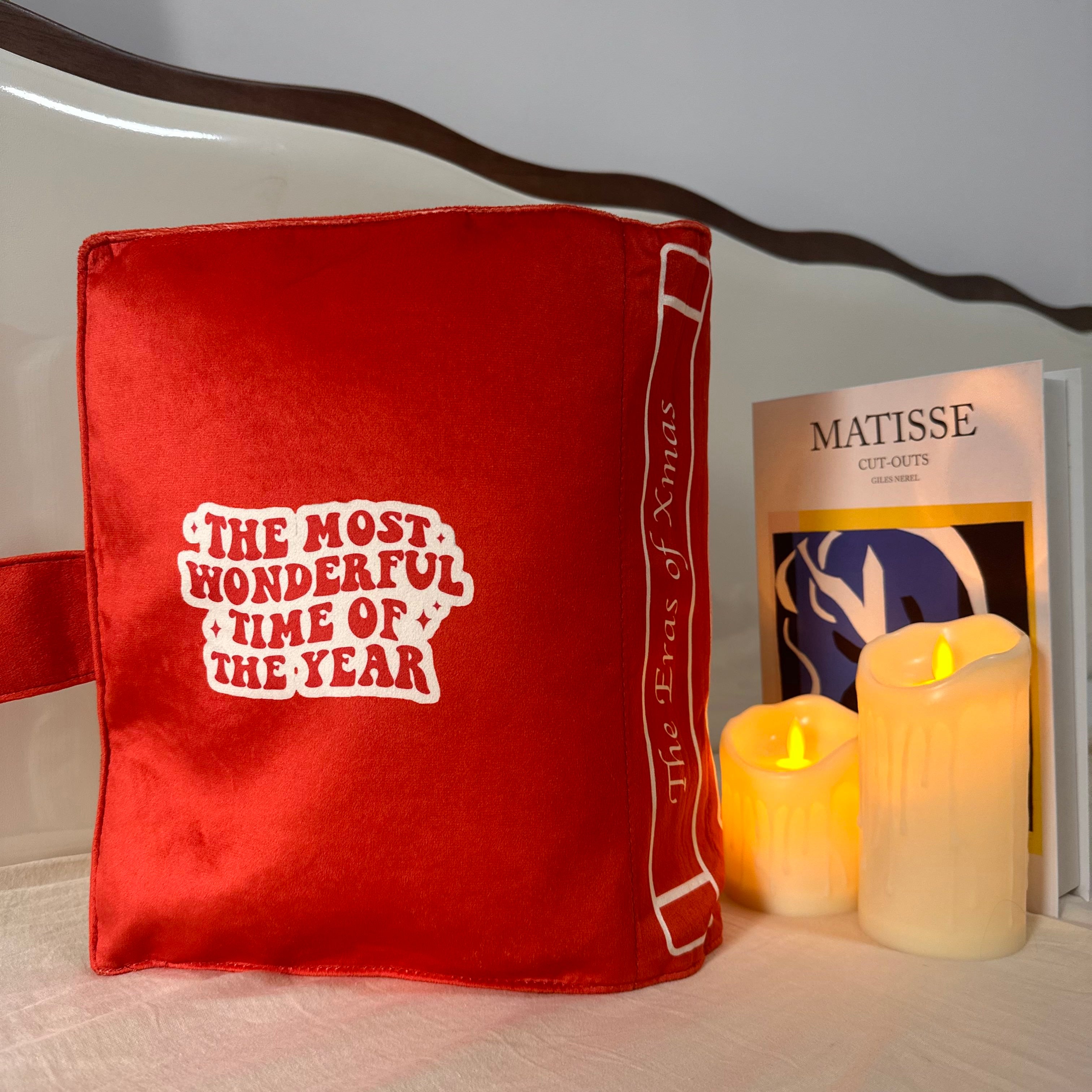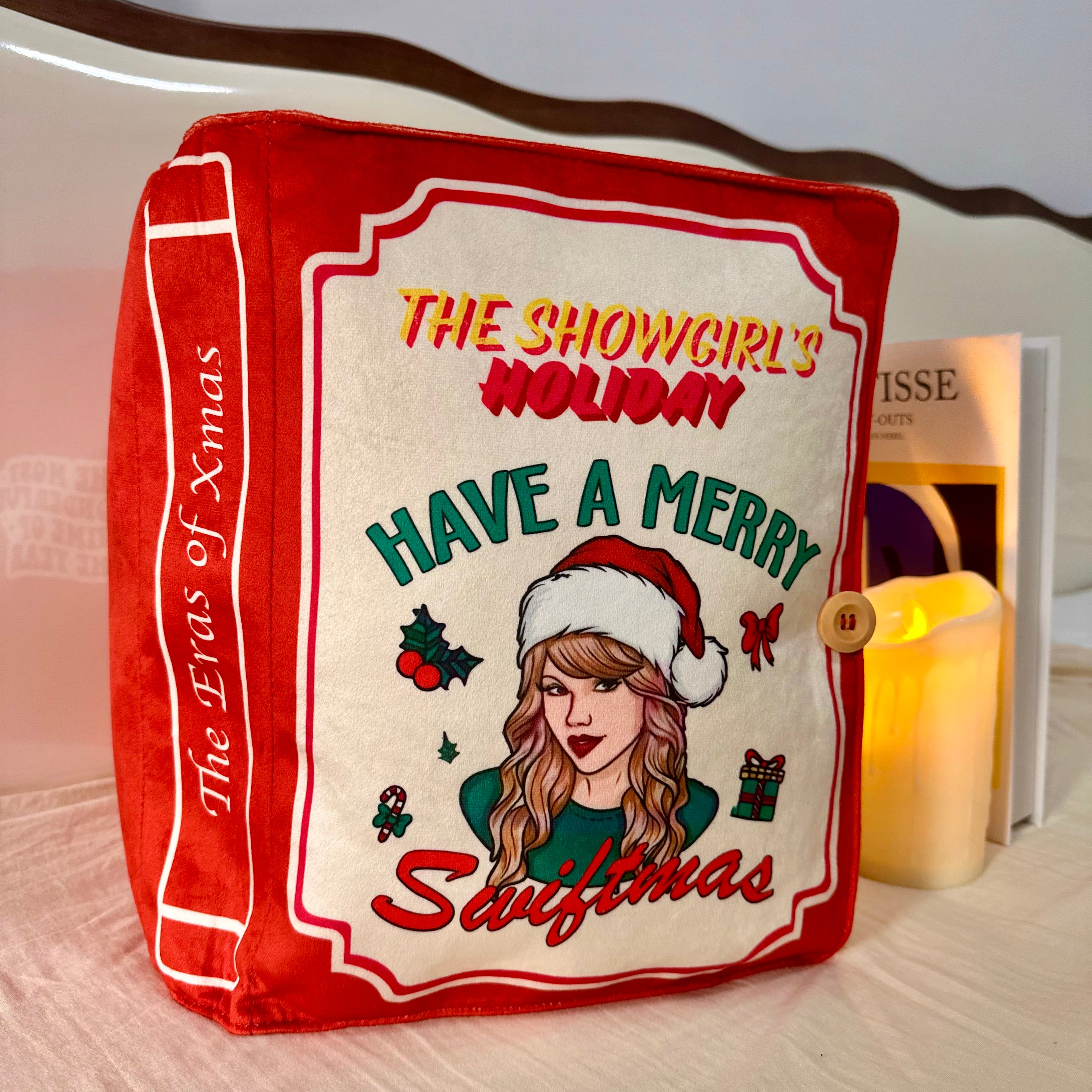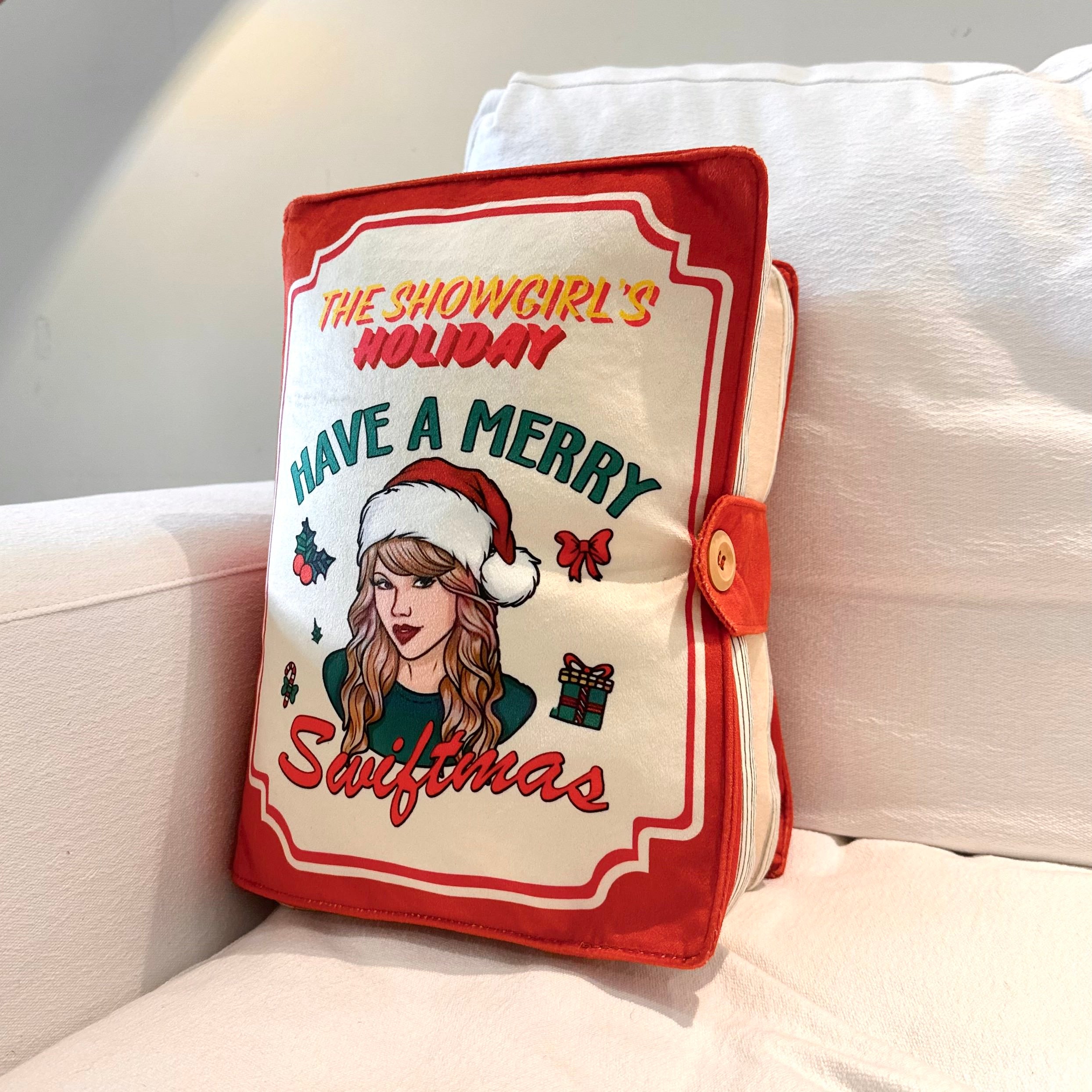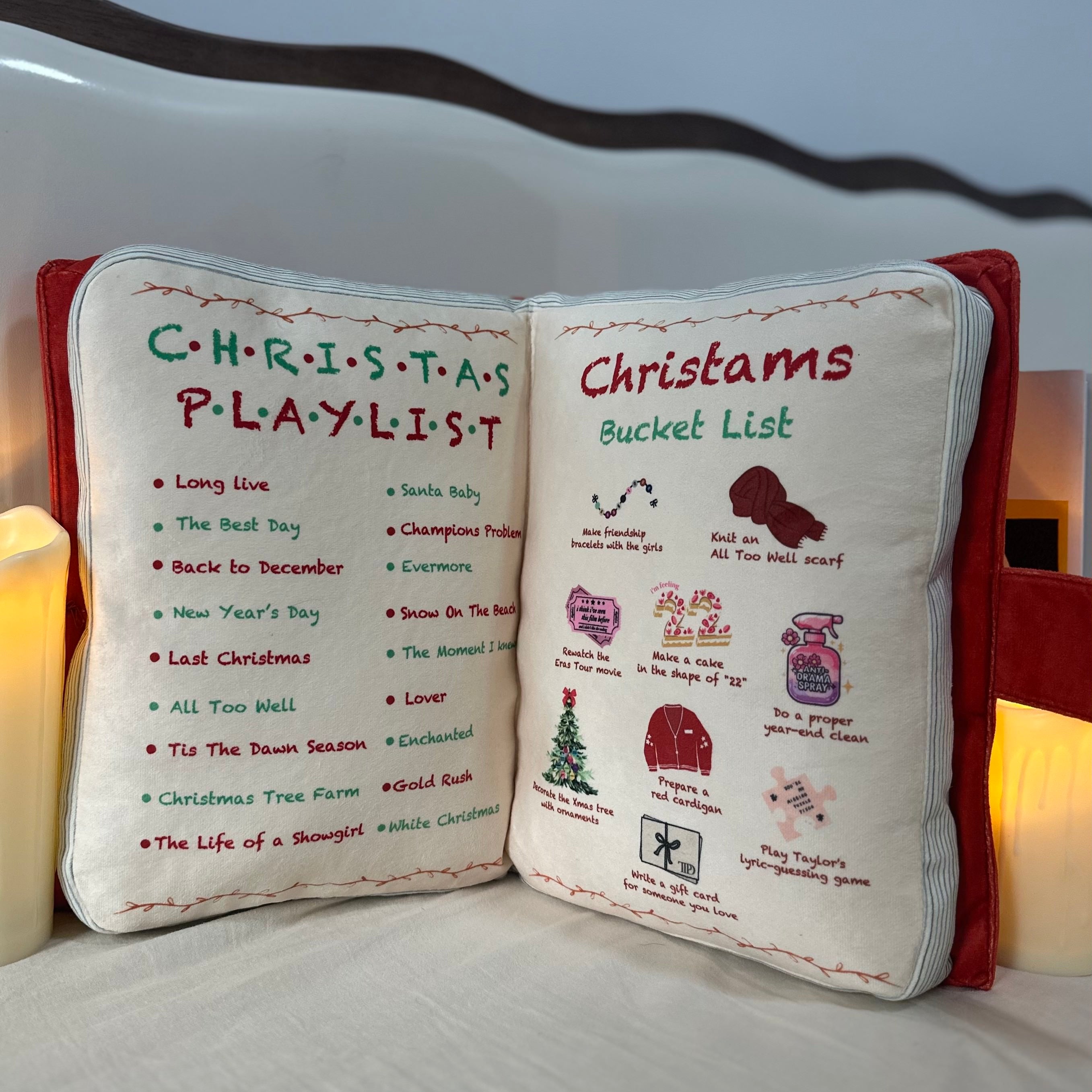 This is a book-shaped pillow designed for Swifties. It's not just an ordinary pillow, but also features a book-like design. When you open the book, it includes a must-listen Christmas playlist and a Christmas bucket list for Swifties.